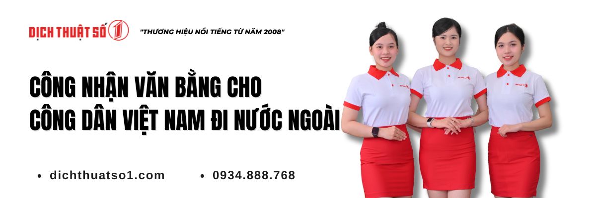 Khi công dân Việt Nam có nhu cầu học tập, làm việc hay định cư tại nước ngoài. Việc công nhận văn bằng là bước thủ tục quan trọng nhằm đảm bảo bằng cấp được chấp nhận và sử dụng hợp pháp. Dịch Thuật Số 1 với nhiều năm uy tín trong lĩnh vực dịch thuật và pháp lý. Cam kết hỗ trợ dịch vụ Công nhận văn bằng cho công dân Việt Nam đi nước ngoài trọn gói. Giúp việc công nhận văn bằng trở nên nhanh chóng, thuận tiện và minh bạch.