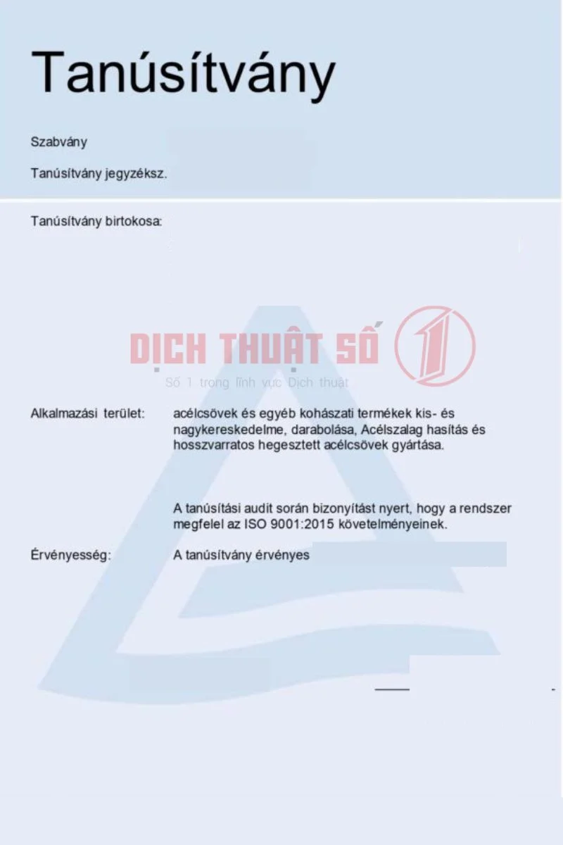 Trong quá trình hội nhập và mở rộng hợp tác quốc tế, nhu cầu sử dụng các chứng nhận chất lượng từ Hungary tại Việt Nam hoặc ngược lại ngày càng gia tăng, đặc biệt trong lĩnh vực xuất nhập khẩu, sản xuất và kiểm định sản phẩm. Tuy nhiên, để các tài liệu này có giá trị pháp lý và được cơ quan chức năng chấp nhận, việc dịch thuật công chứng là yêu cầu bắt buộc. Tại Dịch Thuật Số 1, chúng tôi cung cấp dịch vụ dịch thuật công chứng chứng nhận chất lượng tiếng Hungary chuyên nghiệp, đảm bảo chất lượng cao và thời gian xử lý nhanh chóng.