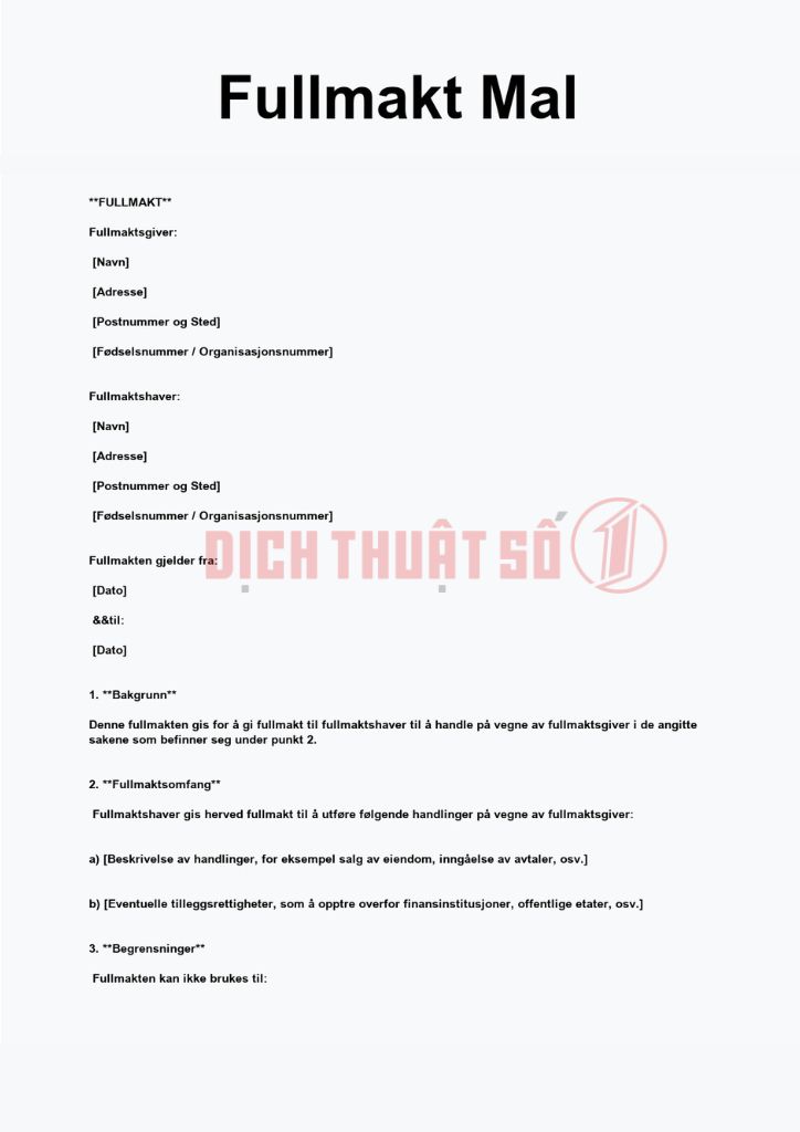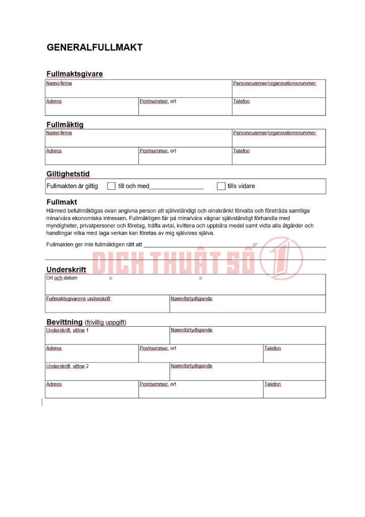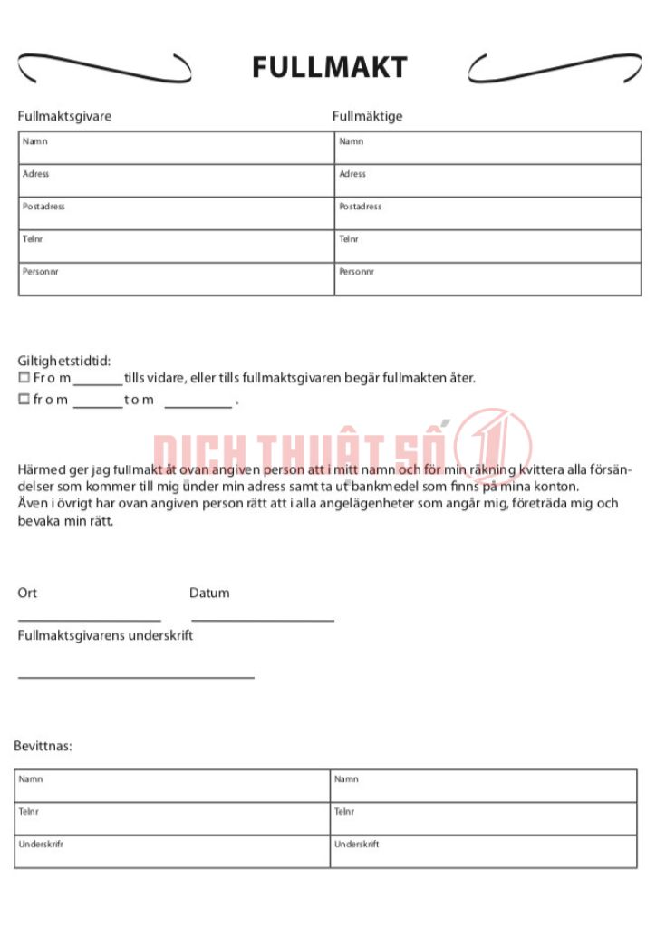 Hãy để Dịch Thuật Số 1 đồng hành cùng bạn trong việc dịch thuật công chứng giấy ủy quyền sang tiếng Thụy Điển. Đảm bảo mọi văn bản đều hợp pháp, sử dụng thuận tiện cho các giao dịch quốc tế.