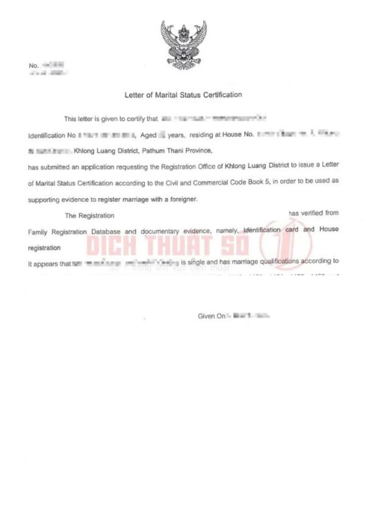 Địa Chỉ Dịch Thuật Công Chứng Giấy Xác Nhận Tình Trạng Hôn Nhân Sang Tiếng Thái Uy Tín