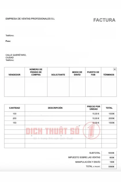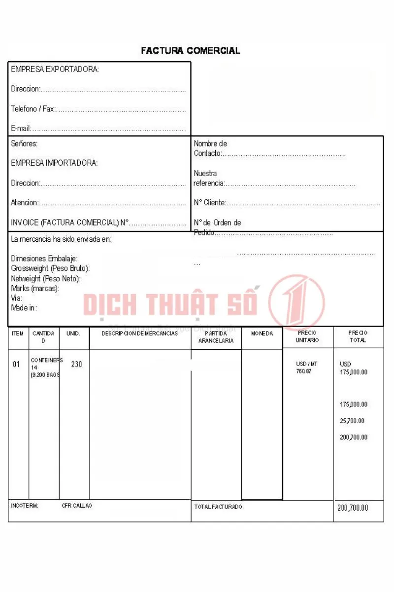 Địa Chỉ Dịch Thuật Công Chứng Hóa Đơn Thương Mại Tiếng Tây Ban Nha Uy Tín