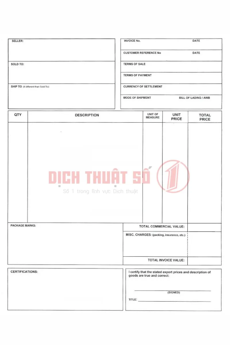 - Thuật ngữ chuyên ngành phức tạp: Hóa đơn thương mại chứa nhiều thuật ngữ về logistics, kế toán, hải quan, thuế và Incoterms. Người dịch cần hiểu đúng bản chất từng chỉ số để chuyển ngữ chính xác.