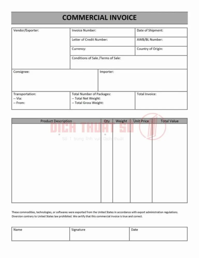 - Hóa đơn thương mại (Commercial Invoice): Là chứng từ quan trọng trong giao dịch quốc tế, đặc biệt khi làm thủ tục hải quan, đầu tư, hoặc đấu thầu.