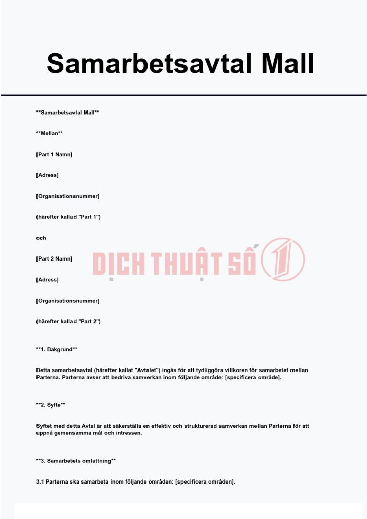 Nếu bạn đang cần dịch thuật công chứng hợp đồng hợp tác sang tiếng Thụy Điển chính xác, hợp lệ và nhanh chóng. Hãy để Dịch Thuật Số 1 đồng hành và hỗ trợ bạn với dịch vụ trọn gói – uy tín – tối ưu chi phí. Chúng tôi cam kết mang đến sự hài lòng tuyệt đối trong từng hồ sơ.