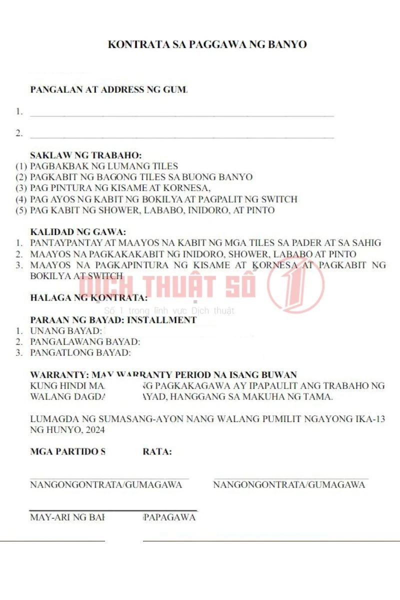 Hợp đồng lao động được dịch sang tiếng Việt bởi dịch giả am hiểu tiếng Philippines và thuật ngữ pháp lý – lao động. Nội dung bản dịch đảm bảo chính xác, thống nhất thuật ngữ và giữ nguyên bố cục so với bản gốc.