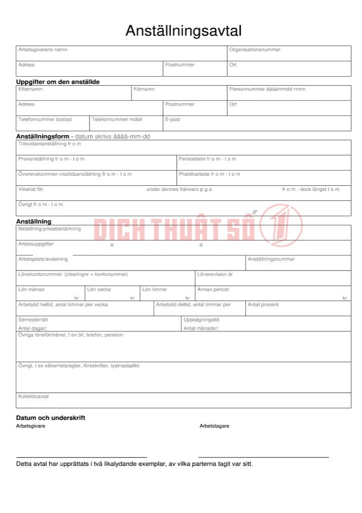 Bạn đang cần dịch thuật công chứng hợp đồng lao động sang tiếng Thụy Điển để sử dụng trong hồ sơ xin việc, hợp đồng quốc tế hoặc các thủ tục pháp lý? Dịch Thuật Số 1 tự hào là đơn vị uy tín, chuyên nghiệp. Đảm bảo bản dịch không chỉ chính xác về mặt ngôn ngữ mà còn phù hợp về mặt pháp lý. Với đội ngũ dịch giả giàu kinh nghiệm và quy trình công chứng nhanh chóng. Chúng tôi giúp khách hàng tiết kiệm thời gian và hạn chế tối đa rủi ro trong quá trình xử lý hồ sơ.