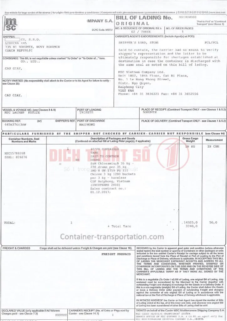 Thủ Tục Dịch Thuật Công Chứng/ Chứng Thực Bản Dịch Vận Đơn Chuyên Nghiệp