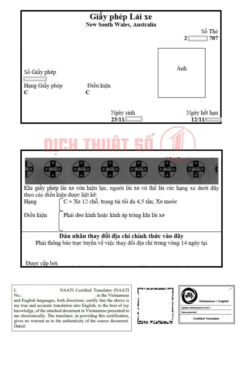 Hãy để Dịch Thuật Số 1 hỗ trợ bạn dịch thuật giấy phép lái xe có chứng nhận NAATI một cách nhanh chóng và chuyên nghiệp. Đảm bảo hồ sơ luôn hợp pháp và được chấp nhận tại mọi cơ quan cần thiết.