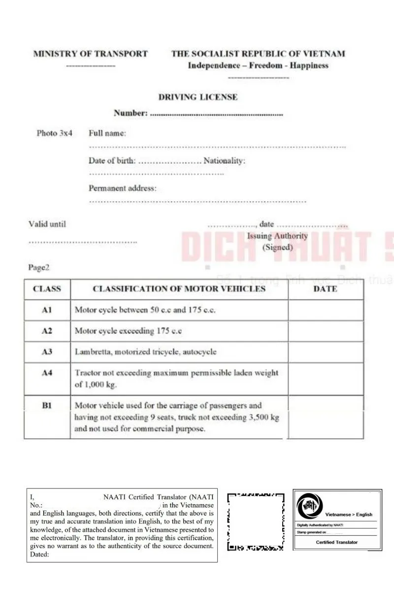 Khi cần sử dụng giấy phép lái xe tại nước ngoài, việc dịch thuật chính xác và có chứng nhận NAATI là vô cùng quan trọng để hồ sơ được chấp nhận. Tại Dịch Thuật Số 1, chúng tôi mang đến dịch vụ dịch thuật giấy phép lái xe có chứng nhận NAATI uy tín, nhanh chóng và đầy đủ, giúp khách hàng tự tin sử dụng giấy tờ hợp pháp tại Úc và các quốc gia khác.