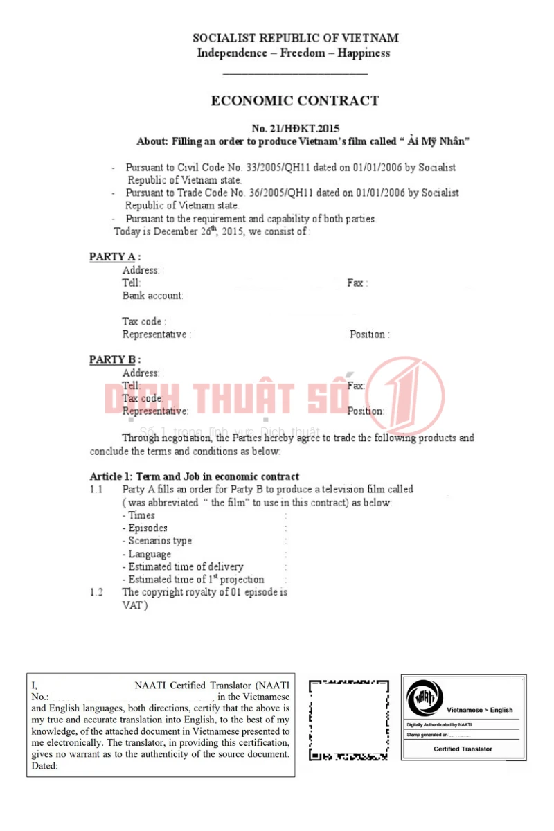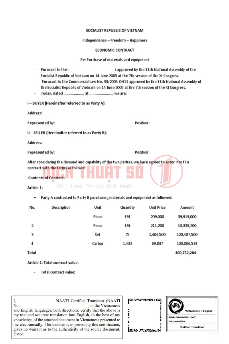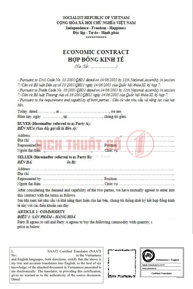 Dịch Thuật Số 1 thực hiện dịch thuật hợp đồng kinh tế có chứng nhận NAATI nhiều loại, đáp ứng đầy đủ nhu cầu của doanh nghiệp: