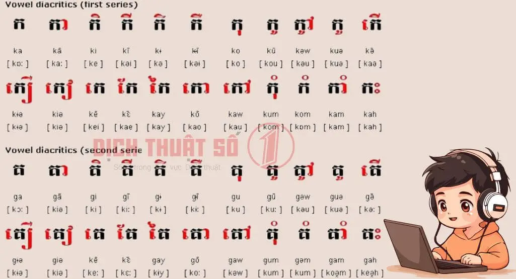 - Số lượng: Bảng chữ cái tiếng Khmer có 24 nguyên âm, được chia thành 2 nhóm: