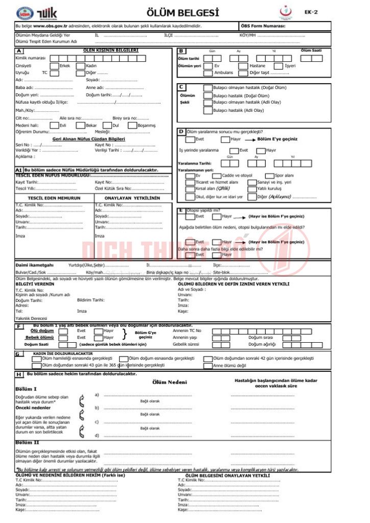 Dịch Thuật/Chứng Thực Bản Dịch Giấy Chứng Tử Sang Tiếng Thổ Nhĩ Kỳ Tại Dịch Thuật Số 1