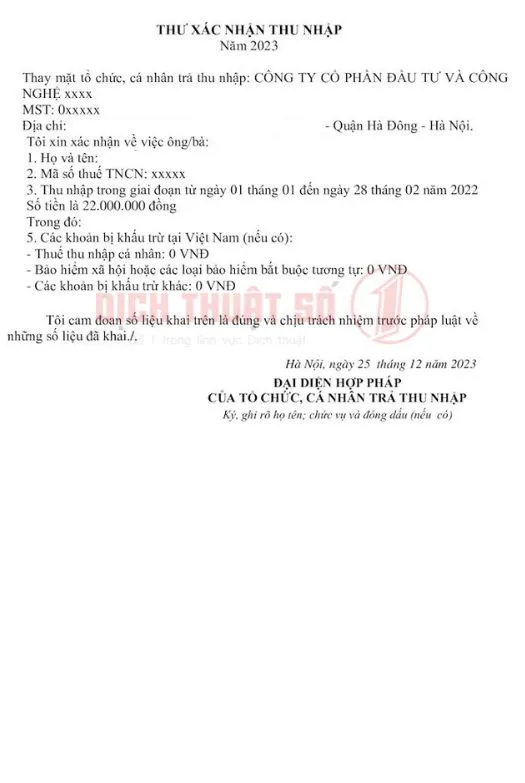 The answer is yes. In many cases, an income confirmation certificate must be notarized for translation if it is to be used at foreign organizations, institutions, or diplomatic offices in Vietnam. Notarized translation not only gives the translated document legal validity but also ensures transparency, accuracy, and compliance with standard formatting requirements.