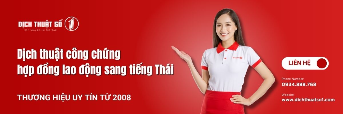 Khi cần sử dụng hợp đồng lao động tại Thái Lan hoặc nộp cho đối tác, cơ quan chức năng Thái Lan. Việc dịch thuật công chứng sang tiếng Thái là yêu cầu bắt buộc để đảm bảo tính pháp lý và hiệu lực sử dụng. Với đội ngũ biên dịch viên chuyên ngành luật – lao động, No.1 Translation mang đến dịch vụ dịch thuật công chứng hợp đồng lao động sang tiếng Thái chính xác, bảo mật và được chấp nhận tại mọi cơ quan nhà nước, lãnh sự, doanh nghiệp quốc tế.