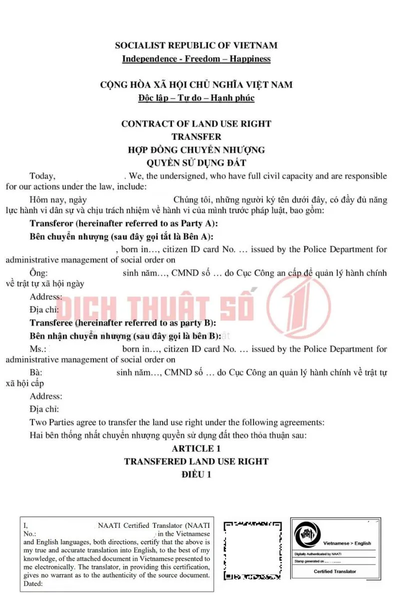 - Hợp đồng chuyển nhượng đất: Bao gồm hợp đồng mua bán, tặng cho hoặc chuyển nhượng quyền sử dụng đất giữa các bên. Dịch thuật cần đảm bảo thuật ngữ pháp lý, điều khoản hợp đồng và thông tin các bên được dịch chính xác.