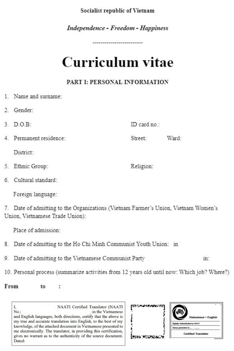 Sơ yếu lý lịch là tài liệu thể hiện toàn bộ thông tin cá nhân, học vấn và kinh nghiệm làm việc. Vì vậy, khi sử dụng tại Úc, bản dịch bắt buộc phải đúng chuẩn NAATI. Các bản dịch thông thường hoặc công chứng tại Việt Nam thường không được chấp nhận thay thế.