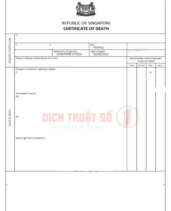 You need hợp pháp hóa lãnh sự giấy chứng tử Singapore để sử dụng hợp pháp tại Việt Nam? No.1 Translation với nhiều năm kinh nghiệm trong lĩnh vực dịch thuật và hợp pháp hóa lãnh sự cam kết hỗ trợ bạn thực hiện toàn bộ quy trình một cách nhanh chóng, chính xác và tiết kiệm thời gian. Chúng tôi cung cấp dịch vụ trọn gói từ dịch thuật công chứng đến hợp pháp hóa tại Đại sứ quán Singapore và Cục Lãnh sự Việt Nam.