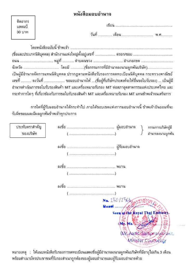 - Bản chính giấy ủy quyền có dấu của Bộ Ngoại giao Thái Lan + 1 bản sao