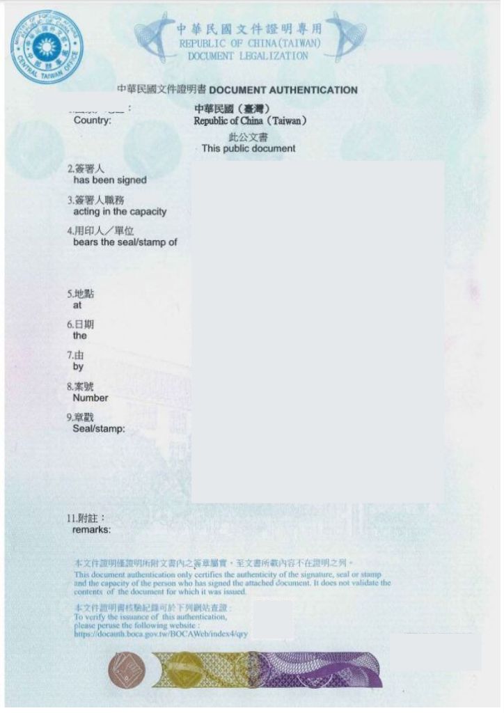 - Taiwan consular authentication: Conducted by the diplomatic authority of the country that issued the document to verify the signature and seal of the competent authority on the document.