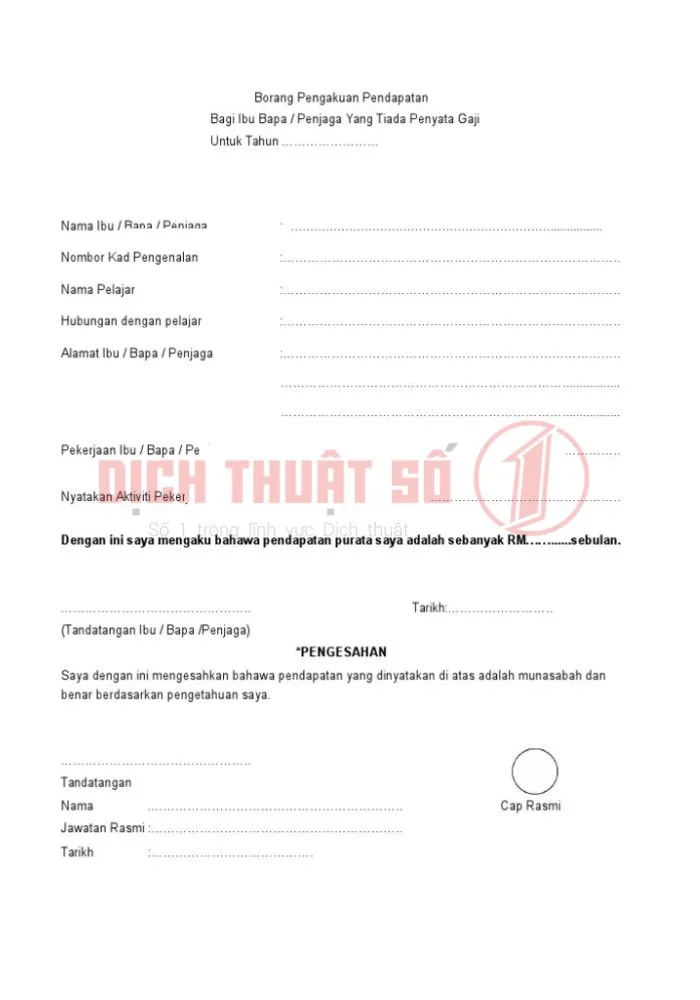 Giấy xác nhận thu nhập cần được dịch sang tiếng Anh hoặc tiếng Malaysia và công chứng tại cơ quan có thẩm quyền (Phòng Tư pháp, Văn phòng công chứng hoặc công ty dịch thuật hợp pháp).