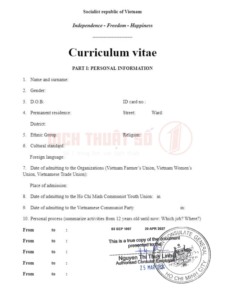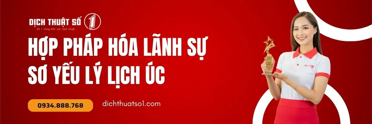 Bạn cần sử dụng sơ yếu lý lịch được cấp tại Úc cho mục đích cư trú, lao động, học tập hay các thủ tục hành chính tại Việt Nam? Dịch Thuật Số 1 là địa chỉ đáng tin cậy cung cấp dịch vụ hợp pháp hóa lãnh sự sơ yếu lý lịch trọn gói – hỗ trợ từ A đến Z, đảm bảo đúng quy định pháp lý và tiết kiệm thời gian.